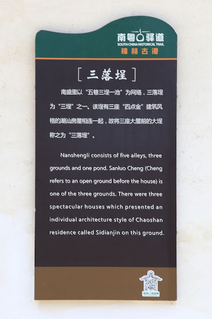 可能是因為這樣的歷史因素,樟林古港似乎從晚清後就一直沈睡至今,而且近年來也沒有趕上改革開放的浪潮,當地的建築大部分被完整的保留下來,不過也因為沒有太多整修,大部分的房舍看起來非常老舊。就像本篇介紹的三落埕,它也是南盛里這大型聚落的一部份,南盛里以"五巷三埕一池"為網路,三落埕為"三埕"之一。該埕有三座"四點金"建築風格的潮汕建築連在一起,故將三座大屋前的大埕稱為"三落埕",畢竟這裡曾經輝煌,三落埕的屋脊都有潮州嵌瓷裝飾,我自己猜測,這些嵌瓷裝飾應該是清代完成保留至今的作品。